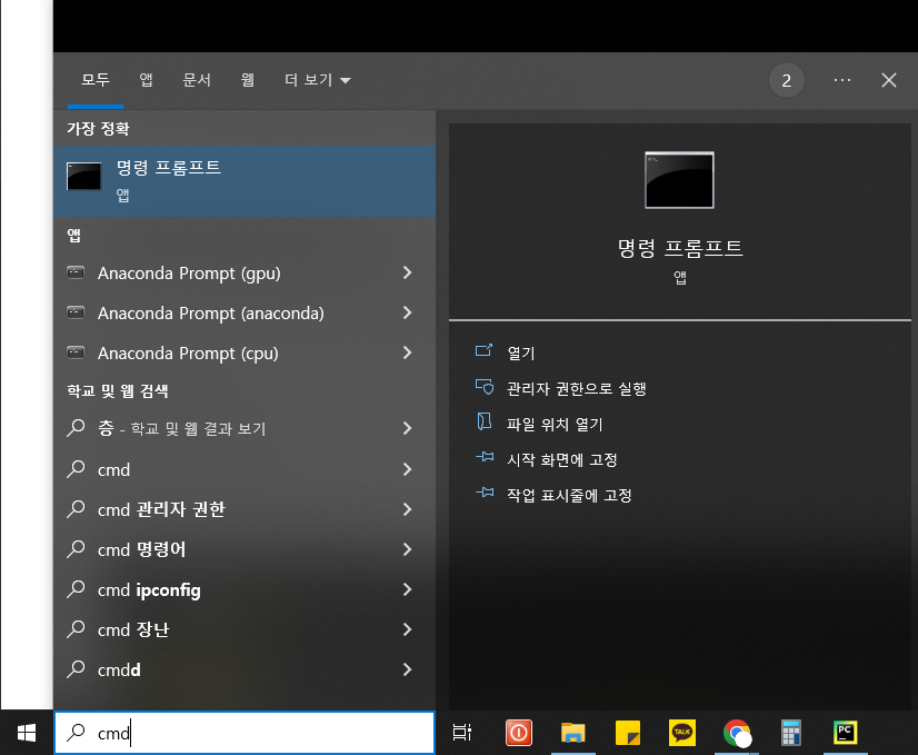 윈도우 왼쪽 아래에 cmd 검색 후 엔터를 눌러 줍니다.