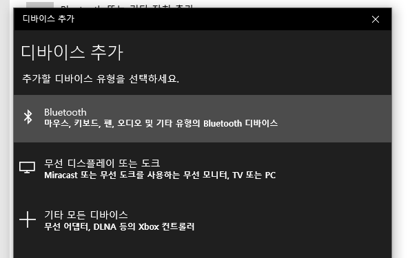 디바이스 추가에서 블루투스를 눌러 주면 컴퓨터에서 할 일은 끝입니다.