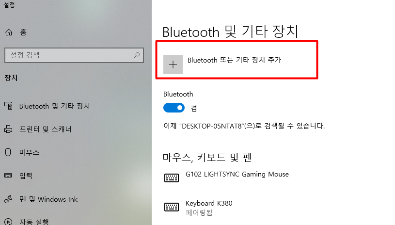 블루투스 및 기타 장치에 들어오셨으면 블루투스 또는 기타 장치 추가 버튼을 눌러줍니다.