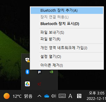 윈도우 오른쪽 하단에 블루투스 아이콘을 우클릭 후 블루투스 장치 추가를 눌러줍니다.