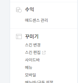 블로그 관리에 들어오면 왼쪽 하단에 스킨편집 메뉴가 있습니다.