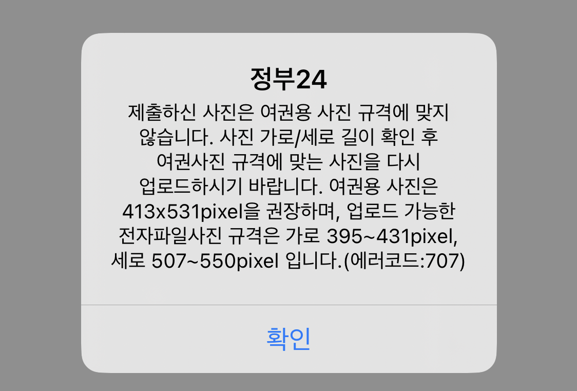 정부 24에 온라인 여권을 재발급받으려고 할 때 사진 크기글 132.2 x 170로 맞췄으나 사진을 업로드하면 이런 경고 문구가 뜹니다. 인터넷에 나온 여권 사진 크기는 잘 못 된 거 같습니다. 413 x 531 px로 맞춰 다시 업로드하니 제대로 되었습니다.