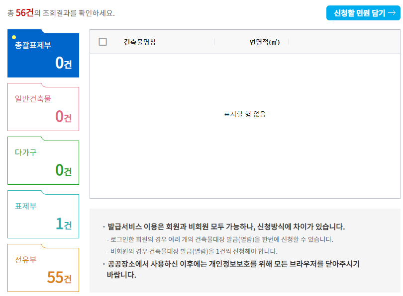 주소를 작성하고 검색하면 아래 사진과 같이 나옵니다. 이후 선택하신 다음에 신청할 민원 담기를 클릭하고 신청하면 건축물대장이 나옵니다. 감사합니다.
