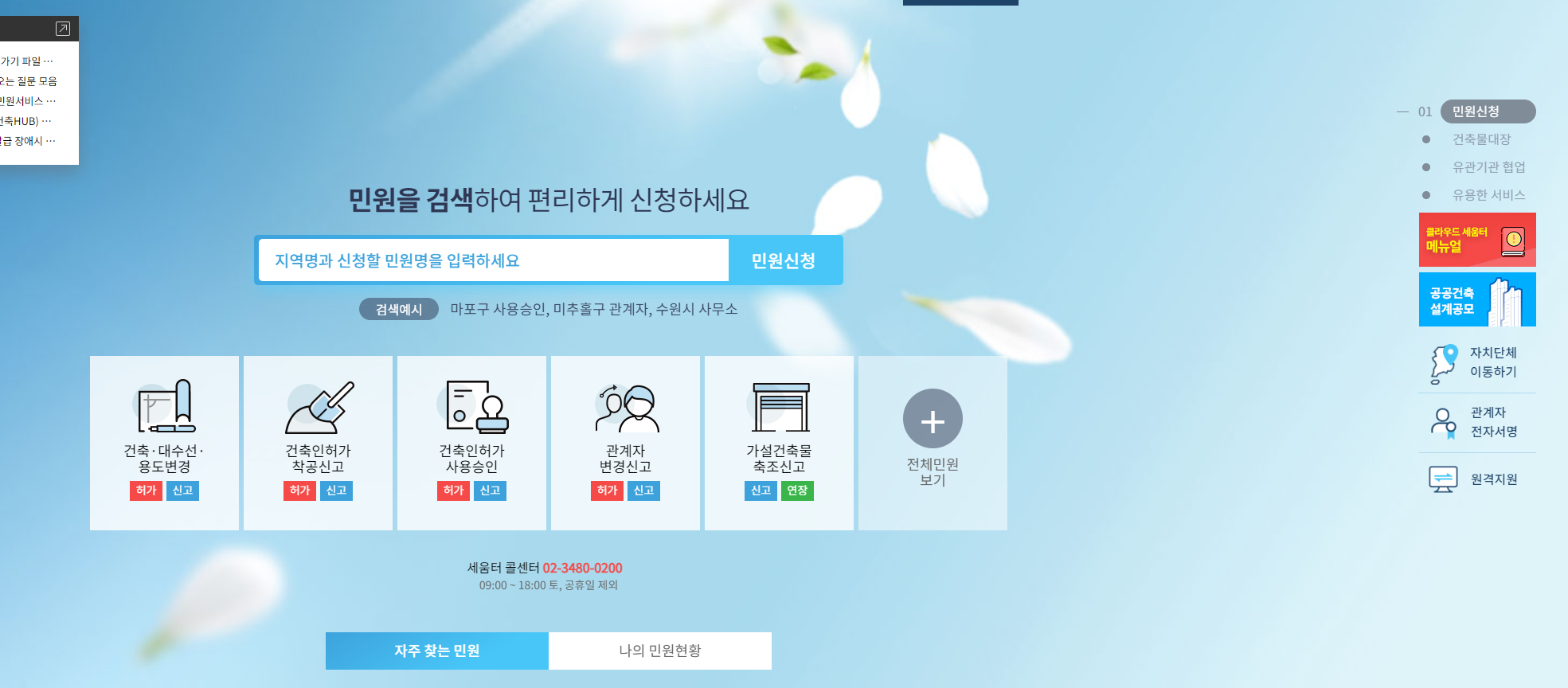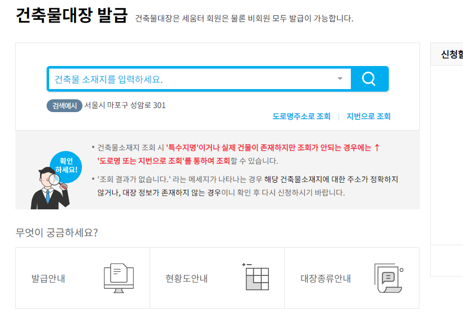 위에 링크에 들어가면 오른쪽에 민원 신청란 아래에 작게 건축물대장이라고 있습니다. 이걸 클릭해줍니다.