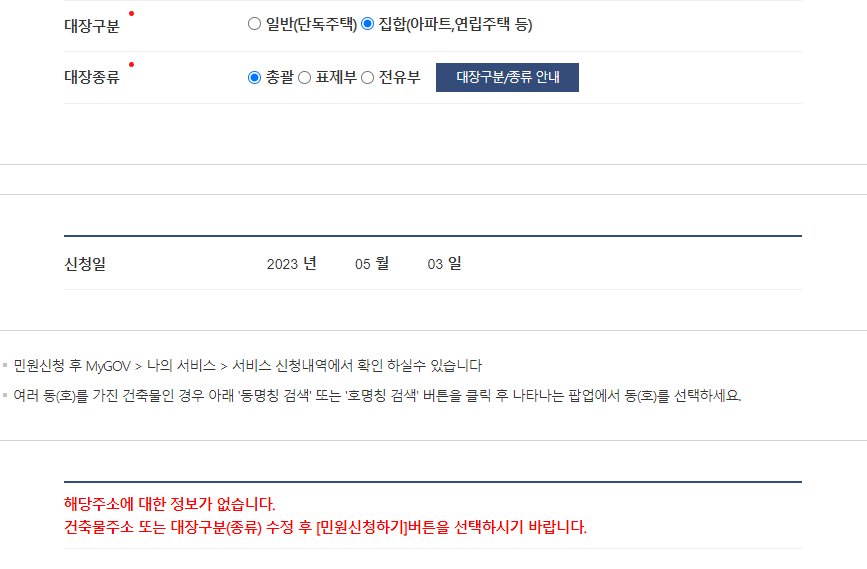 정부 24에가서 건축물대장 발급을 받으려고 하면 아래 빨간색 글씨와 같이 정보가 없다고 뜹니다. 건축물대장 발급 해결방법에 대해 알려드리겠습니다.