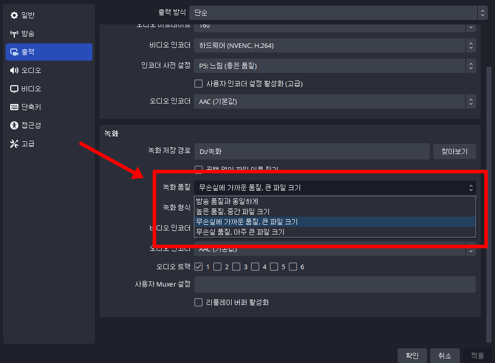 출력 탭에 녹화품질 메뉴에 들어가 줍니다. 무손실 품질을 선택하면 엄청나게 용량이 커집니다. 무손실에 가까운 품질을 선택하면 1/10 수준으로 용량이 줄어드는 것 같습니다. 이상 obs 녹화 품질 설정 방법에 대해 알아보았습니다. 감사합니다.