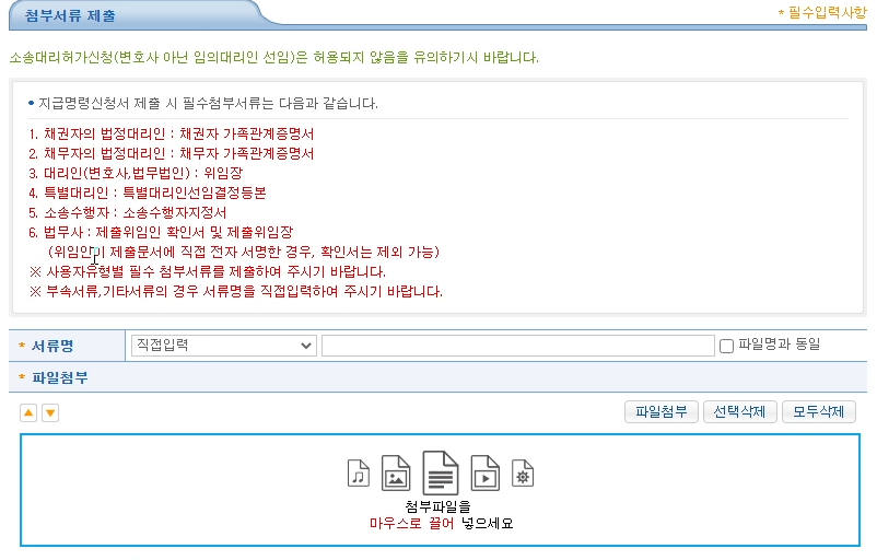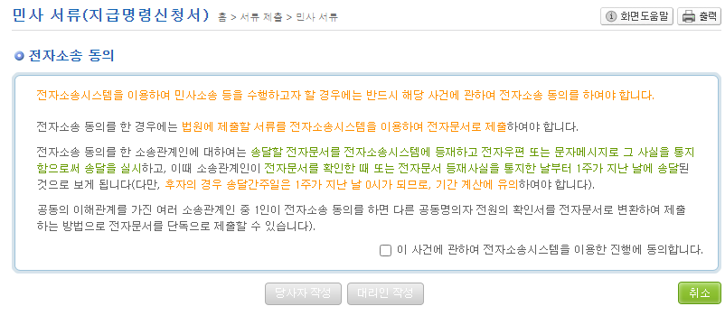 서류제출 - 민사서류 - 지급명령(독촉) 신청 - 지급명령 신청서 순으로 클릭해 줍니다.