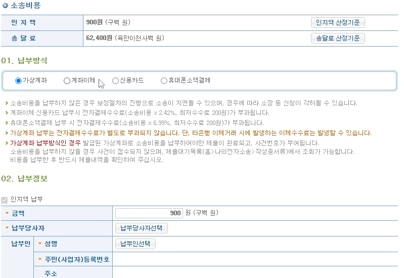 지급명령 신청서, 첨부파일 확인 후 다음으로 넘어오면 소송비용을 납부해야 합니다. 가상계좌가 수수료가 안 들어서 가상계좌로 납부하였습니다. 밑에 납부 당사자 선택과 납부인 선택 등 여러 가지 등록해야 하는데 아마 처음 하더라도 잘 읽으시면 할 수 있습니다. 이후 소송비용을 납부하시면 지급명령 신청이 완료됩니다. 모두 돈 잘 돌려받으시고 본인의 권리는 본인이 지키는 것이기 때문에 이런 소송도 많이 해봐야 할 것 같습니다. 이상 지급명령 신청서 작성방법에 대해 알아보았습니다. 이후에 또 다른 일이 생기면 올리도록 하겠습니다. 감사합니다.