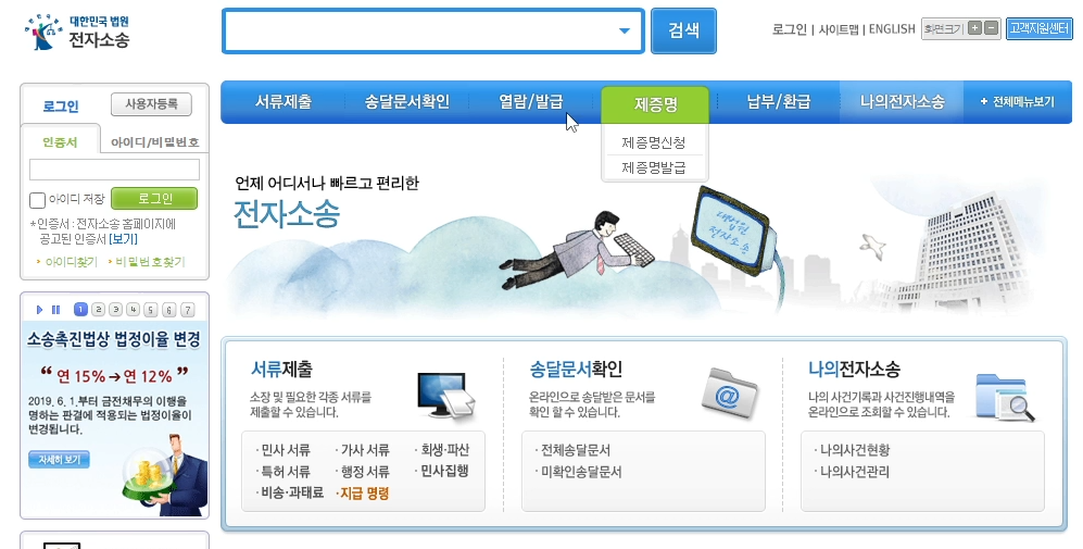 전자소송 홈페이지에 접속해 줍니다. 전자소송을 이용하려면 공인인증서가 필요합니다. 아이디 로그인 후 공인인증서 등록을 해주세요