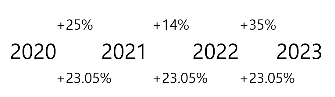 예를 들어 2020년 물가 상승률이 25%, 2021년 14%, 2022년 35%라고 했을 때 2020년부터 2022년까지의 평균 물가 상승률을 구할 때 사용할 수 있다. 매년 평균 23.05%가 상승한 결과가 나온다.