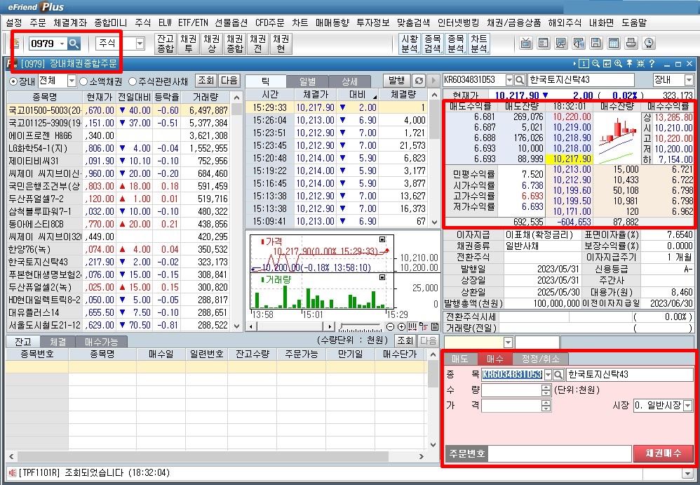 1. 왼쪽 위 돋보기 창에 0979 입력해 [장내채권종합주문] 창을 띄어줍니다.