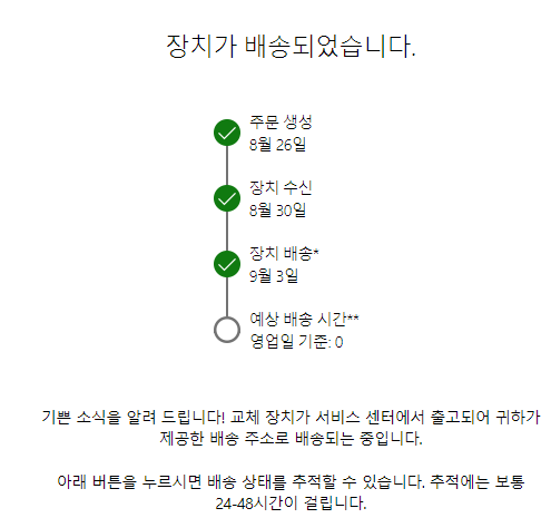 전 2023.08.26 토요일에 신청해서 2023.08.29에 수거해 가고 다음날 장치가 센터에 도착했습니다. 약 5일 만에 다시 장치가 발송되고 그다음 날 도착했습니다. 신청부터 받는 날까지 총 걸린 기간은 10일 정도 됩니다. 리퍼받는데 2주 정도 걸린다 생각하면 될 것 같습니다.
