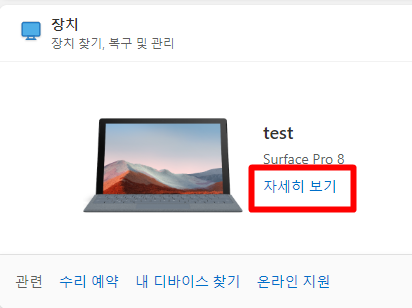 서피스프로에 설치된 윈도우 아이디로 위에 링크 마이크로소프트에 로그인을 해줍니다. 장치 탭에 본인의 서피스프로에서 자세히 보기를 눌러줍니다.