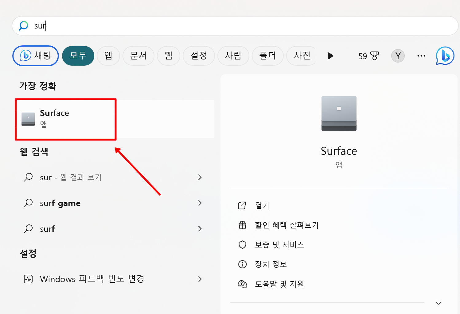 윈도우키를 누르면 검색 창이 올라옵니다. 그럼 검색창에 surface를 입력해 주고 앱을 열어줍니다.