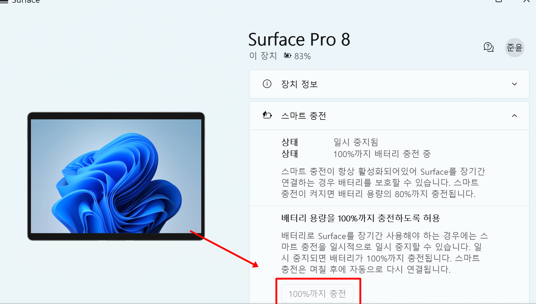 스마트 충전에서 100%까지 충전을 눌러줍니다. 그러면 스마트 충전이 꺼집니다. 서피스프로 스마트 충전 끄는 법에 대해 알아보았습니다. 감사합니다.