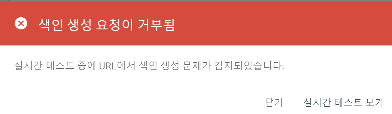 구글 서치콘솔에서 색인 생성을 하다 색인 생성 요청이 거부됨 실시간 테스트 중에 URL에서 색인 생성 문제가 감지되었습니다. 경고 문구가 떴습니다. 해결방법에 대해 알아보겠습니다.