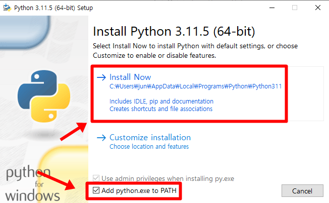Add python.exe to PATH를 체크해 주고 Install Now를 선택해 설치해 줍니다.