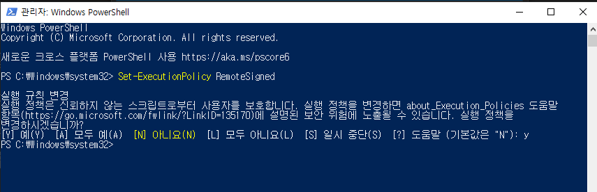 powershell을 관리자로 실행해 줍니다.