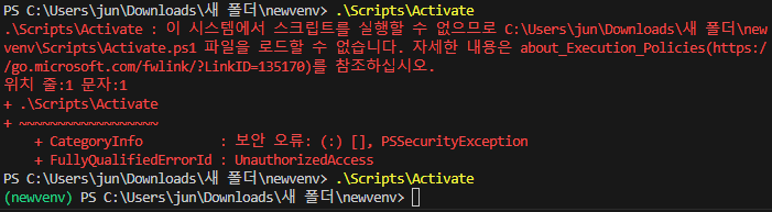 가상환경 활성화를 하려 하는데 위와 같은 오류가 나타났습니다. 해결방법에 대해 알아보겠습니다.