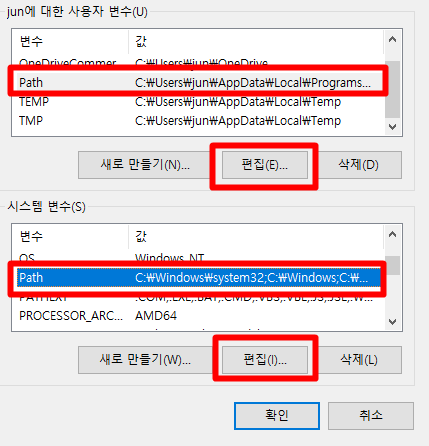 다음 시스템 변수에 Path를 클릭하고 편집을 눌러줍니다. 새로 만들기로