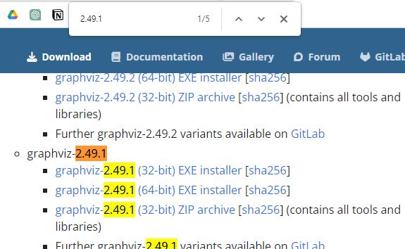 위에 사이트에 들어가서 [ctrl + F]를 눌러 2.49.1을 입력해 graphviz-2.49.1 (64-bit) EXE installer [sha256]을 찾아 주고 다운로드해줍니다.