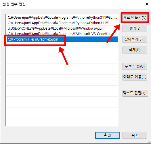 새로 만들기를 클릭해 주고 C:\Program Files\Graphviz\bin을 입력해 줍니다. 확인을 누르고 나와주시면 됩니다.