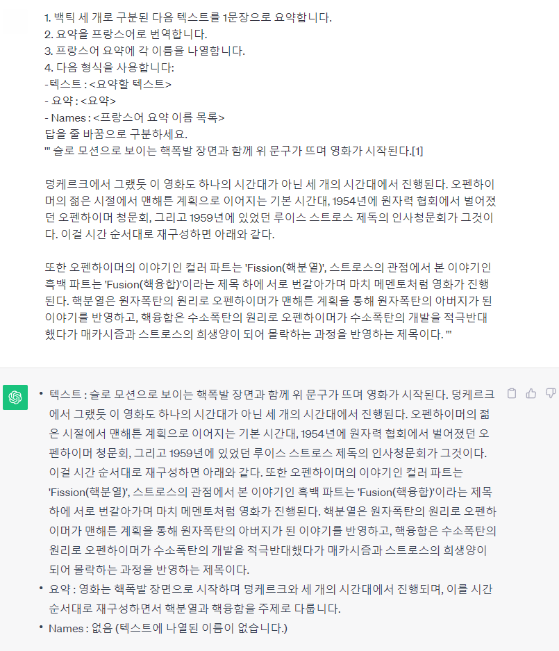 작업을 시킬 때 단계별로 시키는 방법입니다. 그럼 순서에 맞춰 일을 하기 때문에 내용을 빠트리지 않고 수행합니다. 하지만 제가 프랑스어로 요약 번역 해달라 했지만 프랑스어로 번역하지는 않았네요.