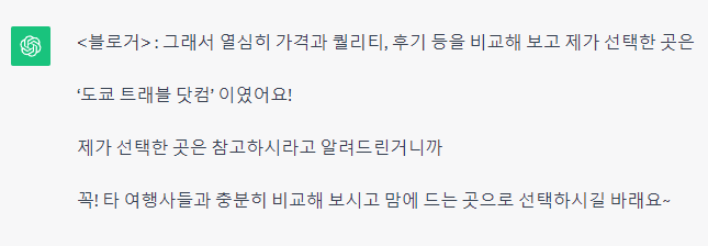 예시를 주면 그와 비슷하게 답변하는 방법입니다. 진짜 블로거처럼 작성했습니다.
