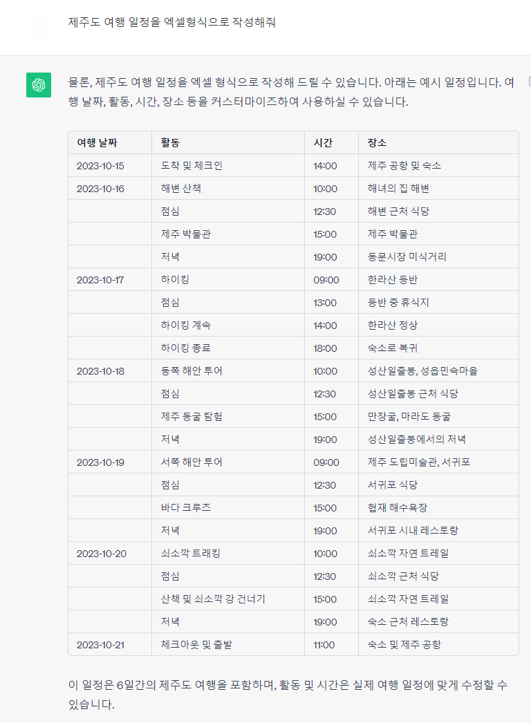 형식을 지정해 줘서 답변을 얻어내는 방법입니다. 위에 사진은 제주도 여행 일정을 엑셀 형식으로 작성 요청한 사진입니다. 상당히 깔끔하게 정리한 내용입니다.