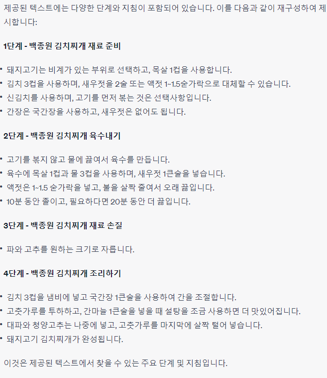 순서가 있는 내용을 깔끔하게 요약하는 방법입니다. 글 내용이 많았던 백종원 김치찌개 레시피 글을 깔끔하게 요약한 것을 볼 수 있습니다.