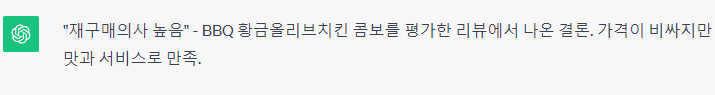 제품 재구매 의사에 대해 초점을 맞추어 요약해달라고 했습니다. 요약이 잘 된 것을 볼 수 있습니다.