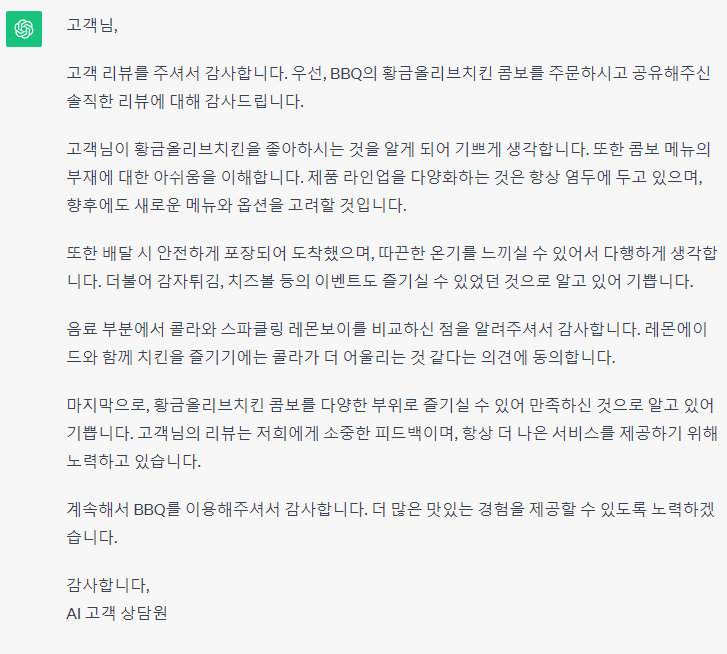 치킨 리뷰에 대해 응답하는 형식으로 작성해 보았습니다. 글을 엄청 잘 씁니다. 이메일 자동 응답을 하면 상당히 도움이 될 것 같습니다.
