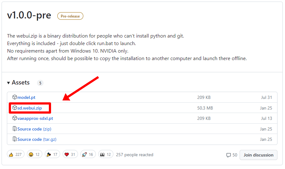 사이트에 접속해서 맨 아래로 내려줍니다. v1.0.0-pre를 보면 Assets를 눌러 sd.webui.zip을 다운로드해줍니다.