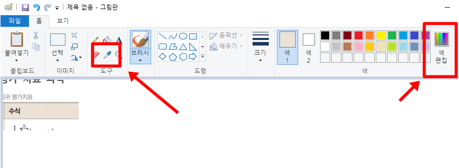 윈도우키 + shift + s를 눌러 색 추출할 부분을 캡처해 줍니다. 그림판을 열어 ctrl + v를 눌러 붙여 넣어줍니다. 그림판에 스포이드를 클릭해 원하는 색을 추출해 주고. 색 편집을 눌러 줍니다.