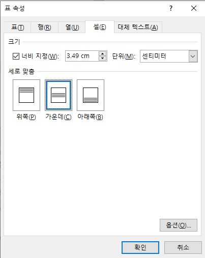 셀 탭에 세로 맞춤에서 가운데를 클릭 후 확인을 눌러줍니다.
