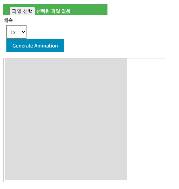 엑셀 파일을 업로드 해주시고 출력할 배속을 선택해줍니다. Generate Animaion을 클릭하면 엑셀 데이터 순서대로 그림을 그리는 애니메이션이 나옵니다.