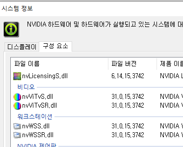 위쪽 구성요소 탭을 클릭해 줍니다. CUDA 버전을 찾아 확인해 줍니다. 저는 아직 CUDA를 설치하지 않았기 때문에 화면에 없습니다.