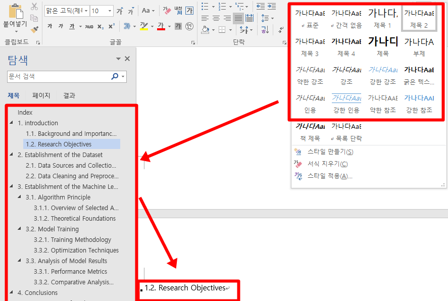제목1이 제일 앞에 있습니다. 제목 1안에 넣으려면 제목 2,3,4, 순으로 설정하면 위 사진과 같이 설정할 수 있습니다. 제목을 설정하면 왼쪽 탐색 창에서 제목을 클릭하면 제목으로 바로 이동이 되어서 굉장히 편리합니다. 제목 설정은 한 번씩 해보면 금방 익히실 수 있습니다. 워드 제목 설정 방법에 대해 알아보았습니다.