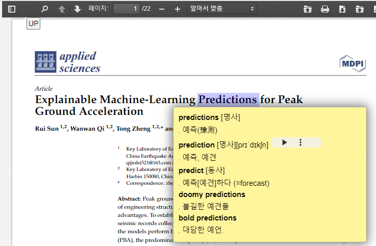 창이 열리면 여기에 영어를 더블클릭하면 사전이 나오게 됩니다. 크롬 pdf에서 사전 이용 방법에 대해 알아보았습니다.
