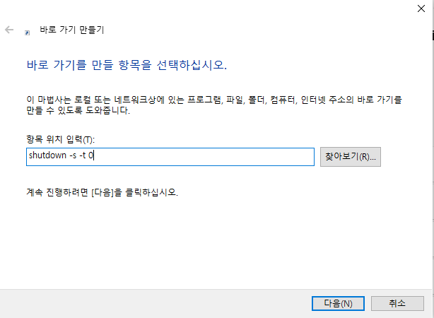 shutdown.exe -s -t 0을 입력해 줍니다.