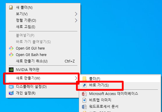 바탕화면에서 우클릭 - 새로 만들기 - 바로가기를 클릭해 줍니다.