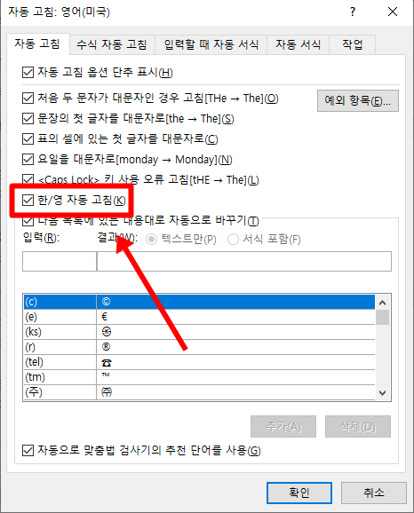 한/영 자동 고침 체크 박스를 해제해 주면 됩니다. 워드 한글 자동변환 끄는 방법에 대해 알아보았습니다.