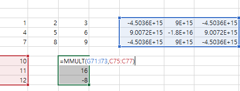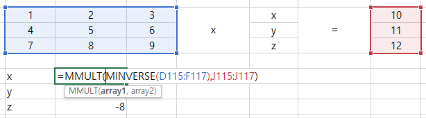 1x3을 선택해주고 =MMULT를 입력해 줍니다. 먼저 3x3셀을 선택해 주고 ,를 누른 후 1x3셀을 선택해 줍니다. 그럼 연립방정식의 해가 나옵니다.