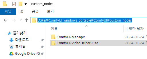 압축 해제후 위 경로(custom_nodes)에 들어가 붙여넣기 해주면 정상적으로 설치가 됩니다 저는 comfyUI manager에서 설치가 안되어서 이렇게 설치했습니다. 대신 이름은 위와 같이 변경해주어야 잘 인식됩니다.