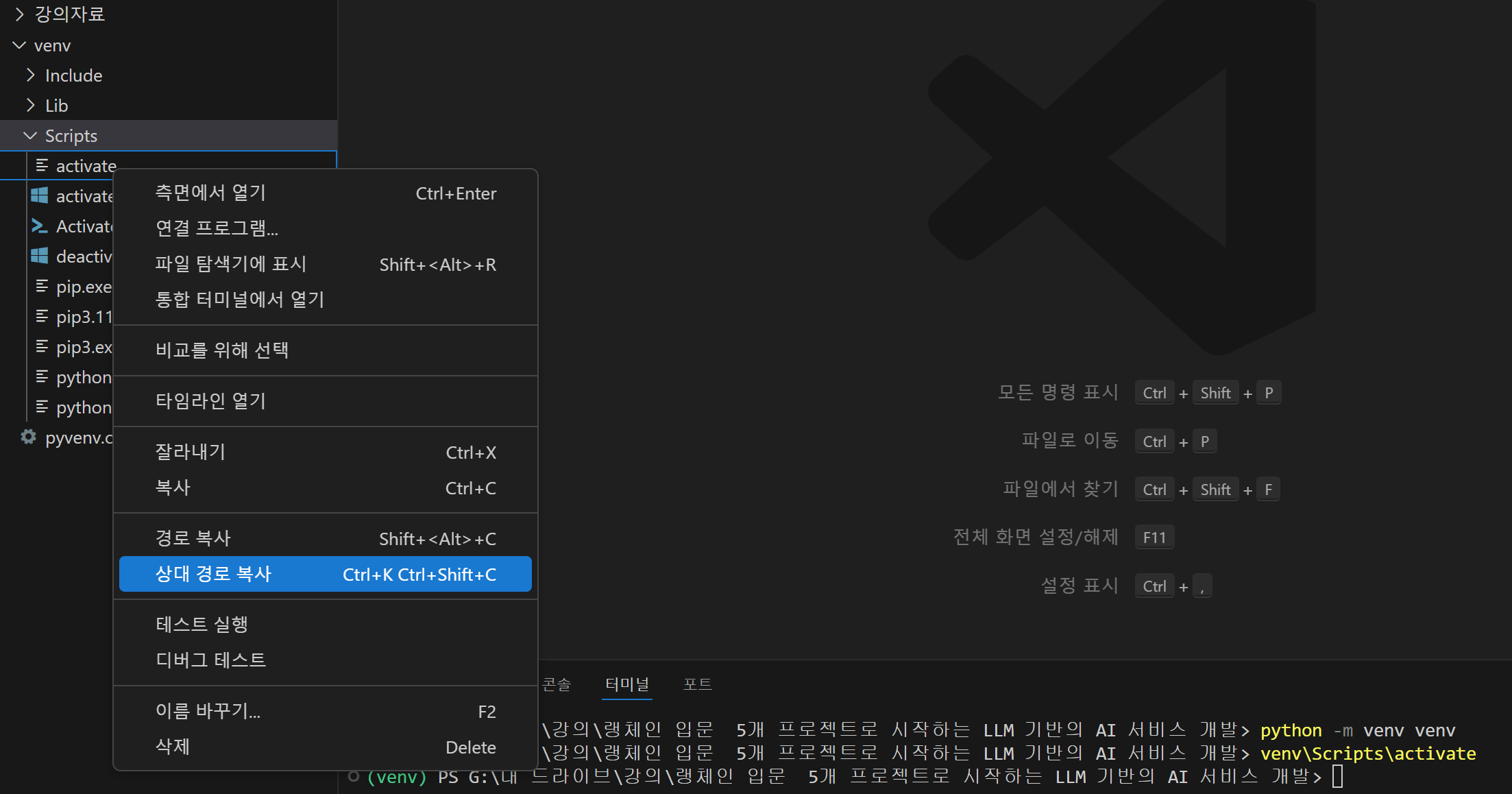 꿀팁 : activate 파일의 상대경로를 복사해 터미널창에 복붙하면 자동으로 활성화가 가능합니다.