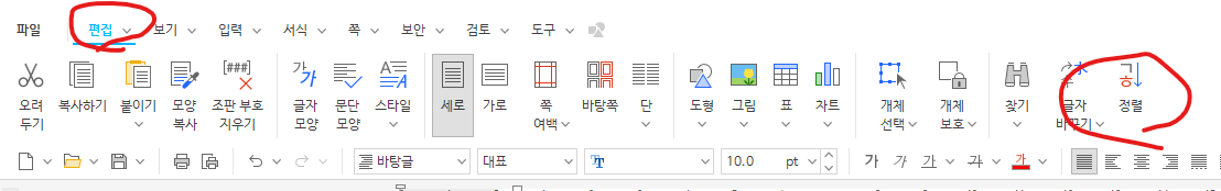 정렬하고자 하는 문단 드래그 - 편집 - 정렬