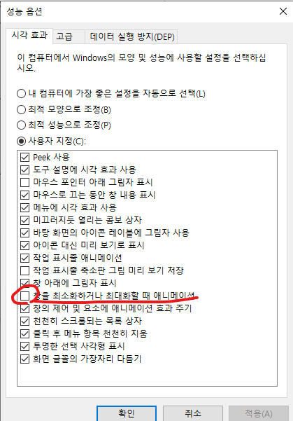 시각효과 - 창을 최소화하거나 최대화할 때 애니메이션을 꺼줍니다.