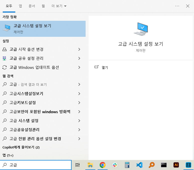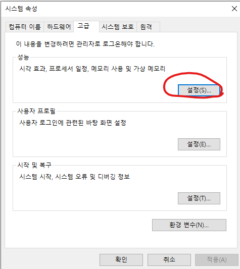 시스템 속성 - 성능 - 설정을 클릭해 줍니다.