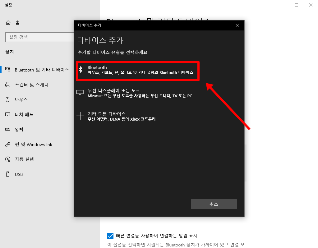 빨간색 박스에 bluetooth 또는 기타 장치 추가를 눌러 줍니다.
