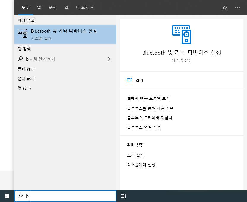 이제 컴퓨터로 가서 시작에 bluetooth 및 기타 디바이스 설정에 들어가 줍니다.